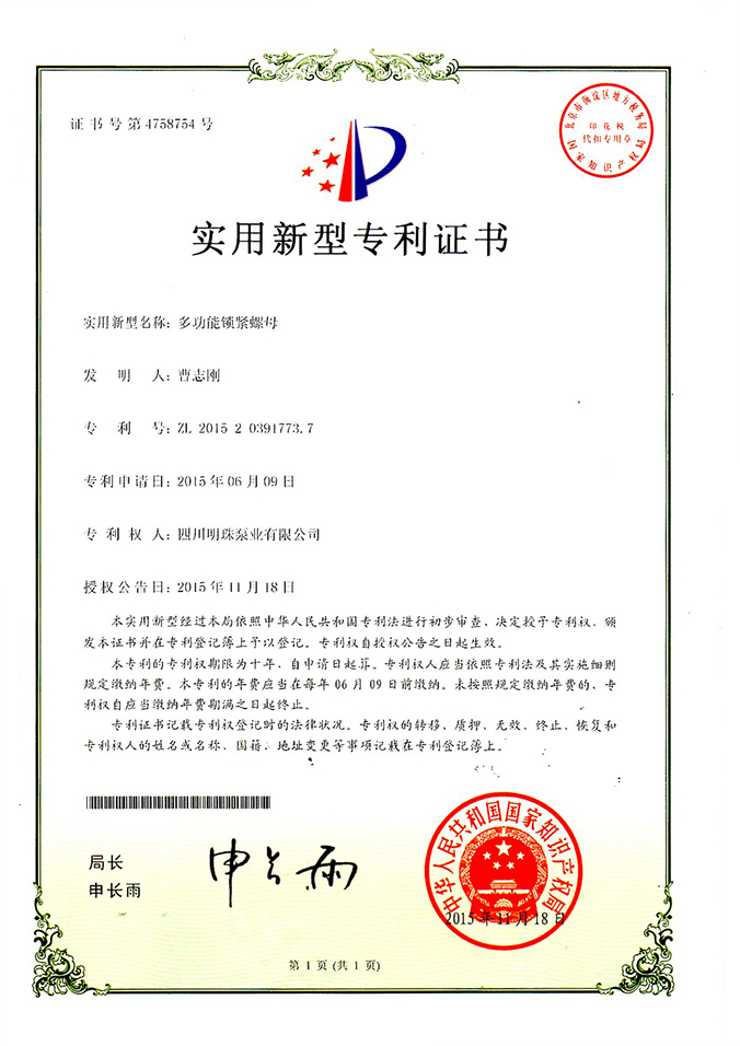 《用于玻璃钢预制泵站水泵的整体耦合架装置》实用新型专利证书