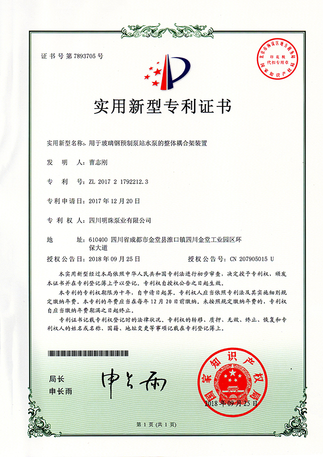 《一种新型玻璃钢预制泵站》实用新型专利证书